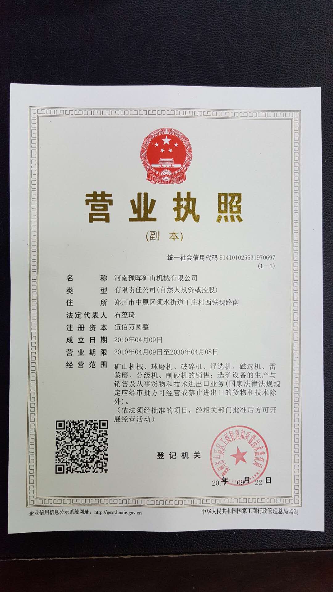河南豫暉礦山機(jī)械有限公司營業(yè)執(zhí)照